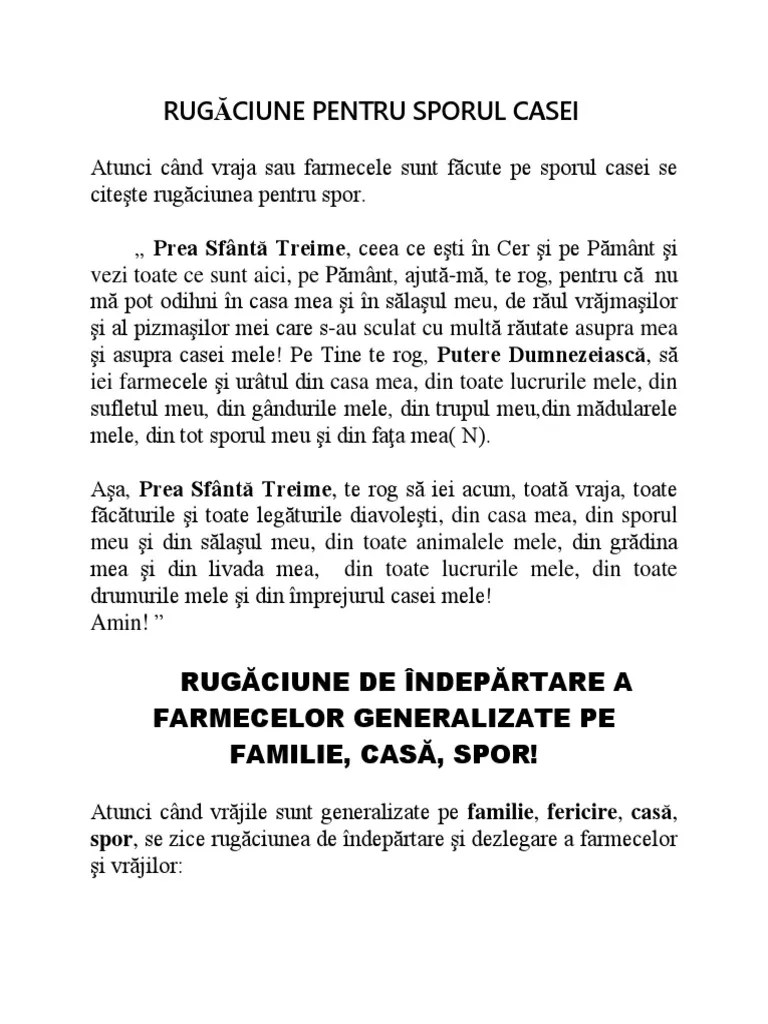 Iată ce rugăciune trebuie să citiți în acest caz…. Sep 04, 2017 · psalmul 126 pentru pacea în familie. În acel moment, citiți cu toată încrederea o rugăciune specială pentru sporul casei. Uneori cineva va poate cere pentru o ora sau pentru cateva zile o suma neinsemnata, ca sa va lege vraji pe bani. Psalmul 126 se citeşte, la nevoie, pentru ca dumnezeu să aducă pace familiei, atunci când acesta este dezbinată de certuri. Nov 20, 2010 · pentru rezolvarea acestei probleme vă dau următoarele sfaturi: Nu apelați la soluții păgâne. Sep 20, 2018 · rugaciune sporul casei nu puține au fost cazurile când oamenii se plâng că nimic nu se mai leagă, iar banii, oricât de mulți ar fi, dispar ca prin farmec.