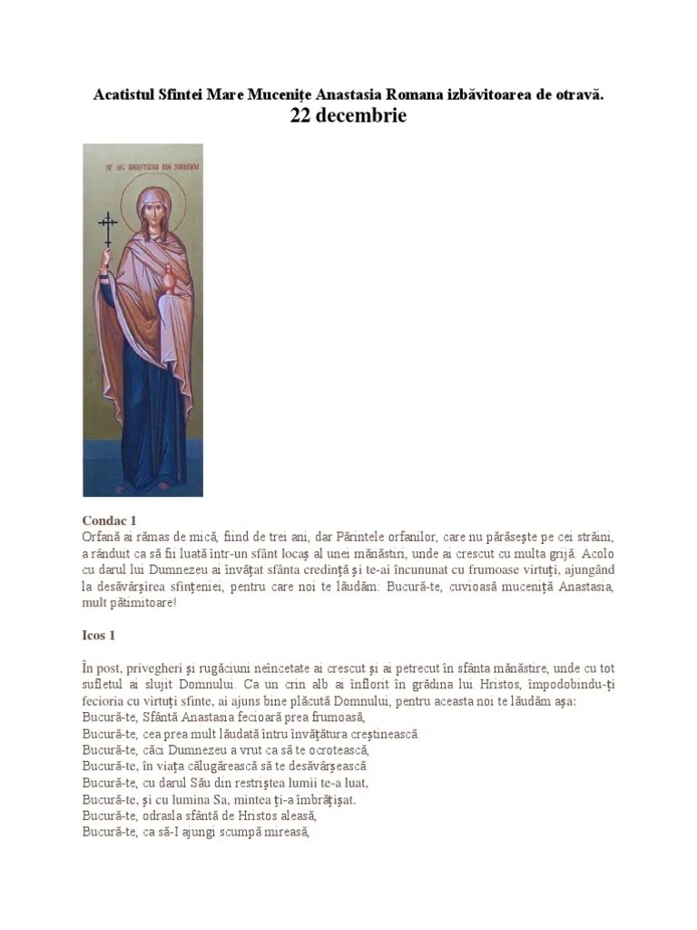 Rugaciune Catre Sf Anastasia. Dec 22, 2016 · rugăciune către sfânta muceniță anastasia, vindecătoarea de răni (22 dec.) această sfântă mare muceniță anastasia, numită și "romana", pomenită pe data … Sfanta mare mucenita anastasia este cinstita pe 22 decembrie. Ca un biruitor ai făcut vitejie, purtătoare … Ci, ca o jertfă fără. Popoare preaînălţaţi pe hristos întru toţi vecii!